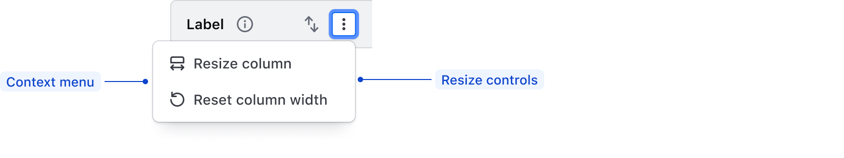 When resizable columns are enabled, actions related to each function are rendered in a context menu in the table header. These functions are not customizable.