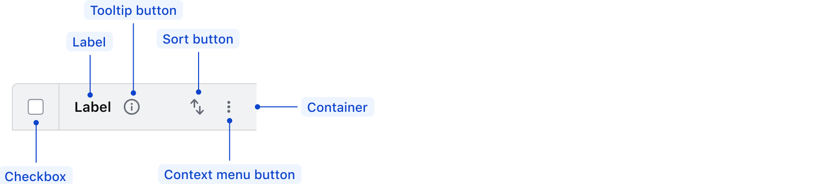 - The label should clearly indicate what type of content is contained within the cell (string, number, status, etc).