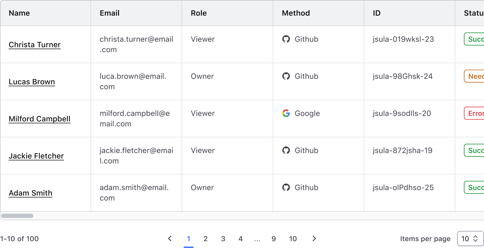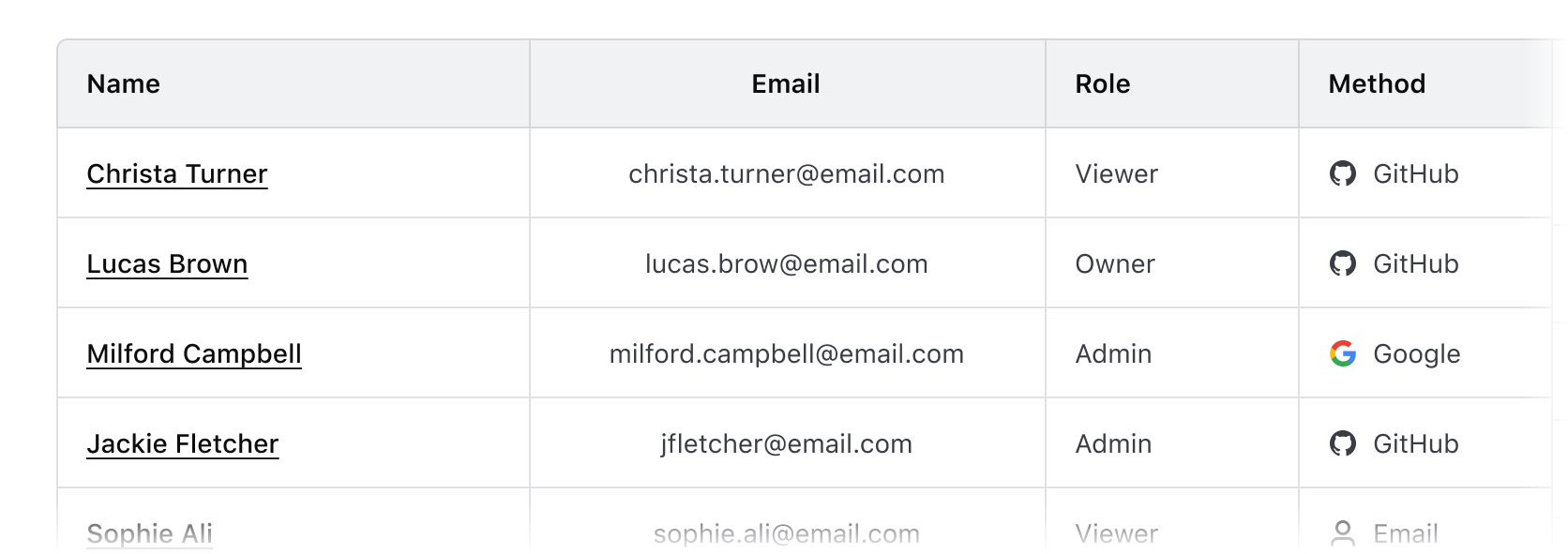 The Advanced Table supports setting the header and the first column as sticky or “pinned.” This can help users navigate large data sets while persisting important identifying values, such as names and IDs.